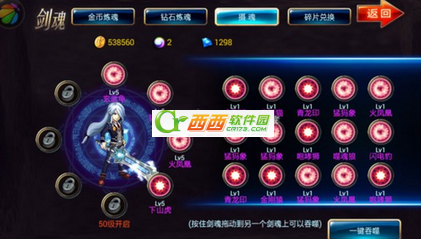 一开始,我们升级剑魂只能一个一个的吞噬其他剑魂,速度相当的慢,25级开启一键吞噬,速度相对提升不少,不过也出现了一些问题: