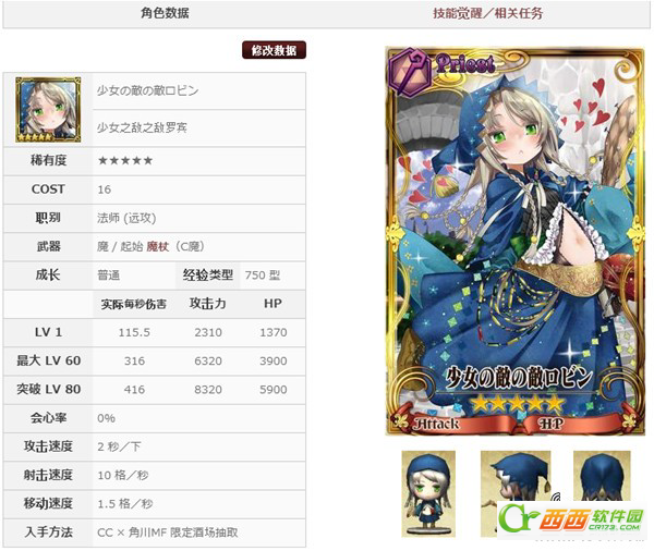 卡牌简介:罗宾是给予违反自然天理的存在(?)“喜欢少女的男性”天诛的奇妙教团一员。最大限度利用自身可爱,充满活力,以及勤奋的少女天性,来获得其他人的赞赏,但是其本性则是毫不折扣的超级S