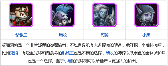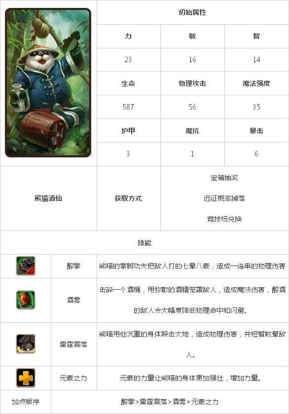 熊猫酒仙是一个强力的物理输出,很强力的物理输出。后期14件紫装是物理系第一,但是,要到后期,在前期没有任何撑血撑魔抗装备的情况下,熊猫酒仙的魔抗 非常低,遇到前期强势的法师,分分钟虐出翔。等到紫色之后,多了“力量强化”的技能,配合自身超高的力量成长,对法师就有了一战之力。因此后期,在竞技场 和副本有很好的效果,远征,基本上是板凳或者——炮灰。