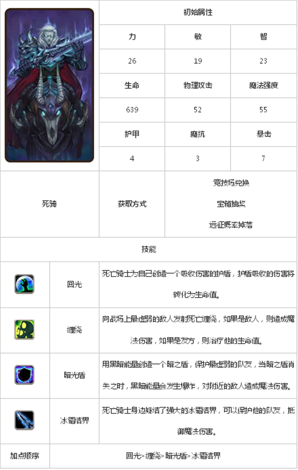 死骑是远征神T,轻松折腾15关满血没商量,不过有了容易入手的死亡先知的暴力法师沉默流在前,死骑的地位可有可无,但是用死亡先知作肉盾在70级之后开 始变难,因为物理系居多,护甲较低的死亡先知很容易在大招回血前被戳死。死骑就显示出了作用。死骑在竞技场的地位,前中期并不好,对大招过分依赖,不一定 站得住,竞技场用死骑建议在72级,这个级别所有英雄都是紫色+2,但是死骑可以紫色+3,此时的他就非常给力。当然,作为副T的死骑开出大招的可能性还 是很大的,但是队伍的输出就不够了。总的来说,死骑对普通玩家来说,基本上是一个定位远征的英雄(放到佣兵中也有很多钱)