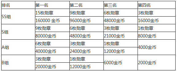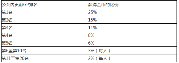 上表所列勋章数目为公会成员每人获得的勋章数量,所列金币则为公会成员合共获得的金币数量,每人获得的金币数目按照公会内贡献GP排名计算,比例表列如下: