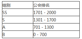 所有公会将按照公会排名分为SS、S、A和B合共4个组别表列如下: