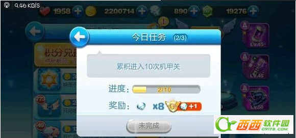 累计进人10次机甲关也可以这样完成,进人游戏就点左边的机甲标志然后点暂停,重新开始就行了,很快就完成任务了