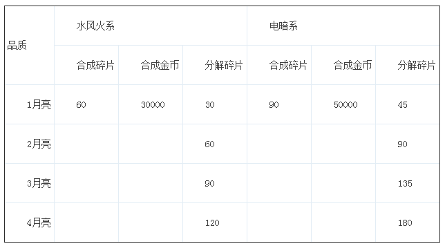 (1)合成:60个碎片,30000金币,其中一半可用万能碎片代替