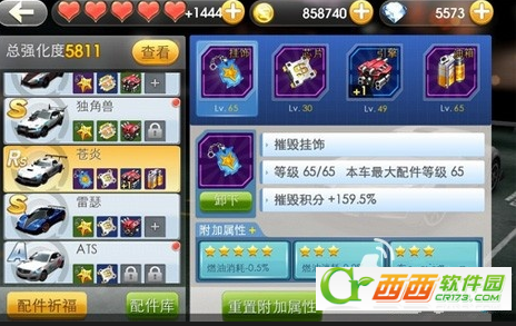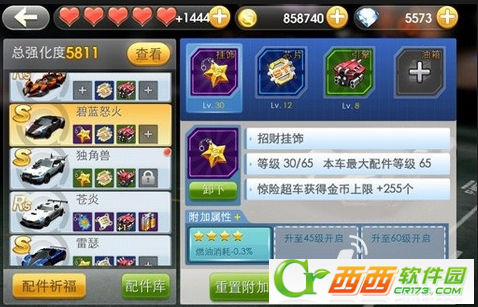 3、配件仓库一开始一共50个空间,扩展到80得花50钻,黑白觉得大家没必要去浪费这个钻石,因为没有任何意义。仓库50个空间是未装备的配件和升级材料(包括配件和结晶)共用的,玩家一旦得到配件、黑白建议都装到车子上面去,一个配件栏也别浪费,这样可以提高车子的总强化度。在这里我说下车子的总强化度,总强化度不是说你拥有的紫色配件越多、总强化度就越来高,反之总强化度是每个装到车子上的配件的平均强化度决定的。
