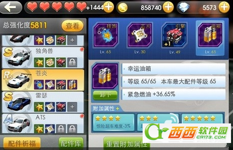 6、目前的配件,最佳组合是摧毁挂饰+隐身芯片+变道引擎+幸运邮箱!除了这几个,其他的都是豆比!别跟我提什么加速引擎,加速引擎加的是加速度,也就是撞车后的提速速度,因为对于豪族奶爸、赵阳等这样的高手来说基本是很少撞车的、撞了也有300金币的极速提到最高速度!而变道引擎65级满级加的13秒的变道速度、跟Rs逐风搭配起来简直是如虎添翼!那个副油箱就别瞎跟我叽歪了,你看清没?!人家说加的是单局额外加油!65级紫色都抵不过小橘子40%的属性!而幸运油箱是+紧急燃油36.65%,它是建立在1500油和2钻油的基础上,才能展现它的优势,也就是说,你不用1500油或者钻油,幸运油箱就是个摆设,这种加油机制是等同SUNNY的。