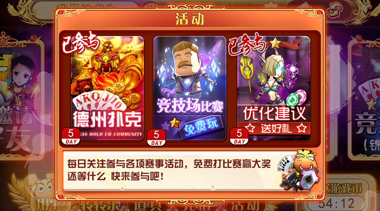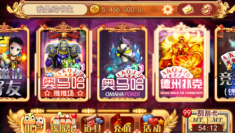 在常规游戏之余,《MT爱德州》中还有丰富的活动和特色玩法,不会让玩家因为金币没了而沮丧。在活动栏中查看最近有什么活动,参与其中即可获得大量的金币呢~这里悄悄透露两个根本停不下来的游戏!那就是刮刮卡和摇摇乐功能,玩家每日登陆都会获得系统赠送的一张刮刮卡,内含有金币奖励,甚至实物奖励都有可能出现哦。