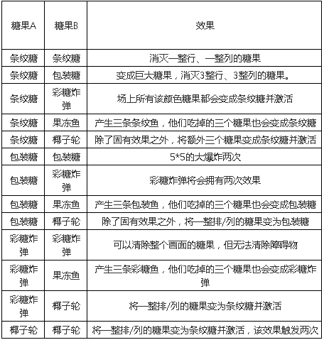 两种(横纹和竖纹),横纹的条纹糖可以消灭糖果所在位置那一整行,竖纹的条纹糖可以消灭那一整列。