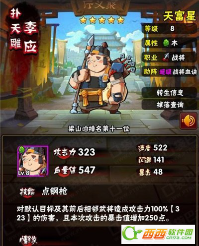 李应:战将,梁山排名第十一的好汉,绰号“扑天雕”。技能:点钢枪,对默认目标及其前后相邻武将造成攻击力100%的伤害,且本次攻击的暴击值增加250点。