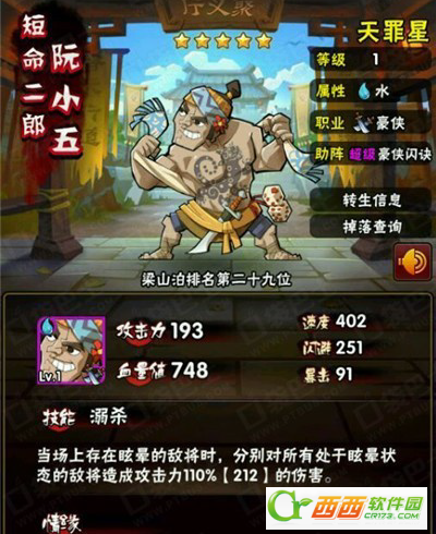 阮小五:豪侠,梁山排名第二十九的好汉,绰号“短命二郎”。技能:溺杀,当场上存在晕眩的敌将时,分别对所有处于晕眩状态的敌将造成攻击力110%的伤害。