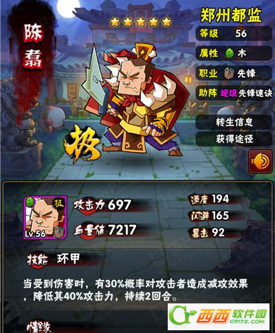 陈翥:先锋,郑州都监。技能:环甲,当受到伤害时,有30%概率对攻击者造成减攻效果,降低其40%攻击力,持续2回合。