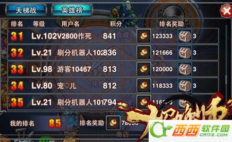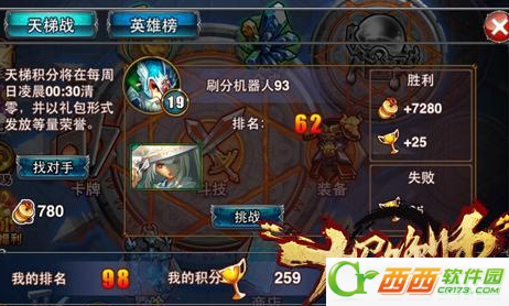 挑战天梯击败周围的对手,登上天梯的顶端。挑战胜利获得更多的积分,积分越多排名也就越靠前,同时排名越高获得的奖励也就越丰富,每天可以领取一次大奖。