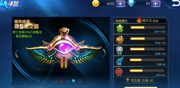 荷鲁斯之眼是天天炫斗中的一个神器,天天炫斗中每件神器都有各自的特殊效果,强大的被动属性才能使得它们够格称得上神器,荷鲁斯之眼套着神话传说的光芒登上炫斗的舞台,必然不是平庸之辈!据说上古神迹所遗留下来的神器,生死一念之间,拥有让人起死回生的能力。这便是遗迹神器:荷鲁斯之眼。下面就来具体说说它的作用。