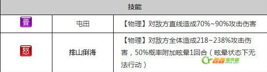 排山倒海 对敌人全体造成218-238%攻击力的伤害,并附加50%概率的晕眩一回合