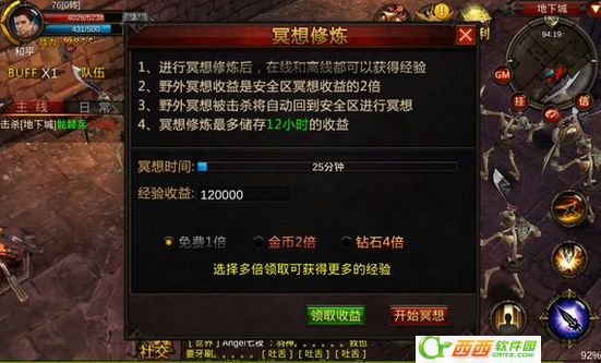 冥想最多可以保留12小时的冥想经验,并且野外冥想比安全区冥想经验高,但是有一定危险。如被击杀将自动回到安全区进行冥想。
