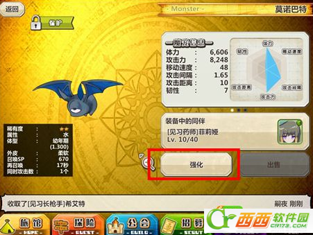 然后我们点击强化按钮。我们看到它要吃的素材显示在右边,满足了它的肚子,它就会成长啦。