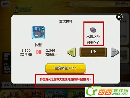 注意,体型不一样的魔宠要吃的东西也不一样,就像婴儿吃奶粉,但是上小学了总该吃点像样的吧。