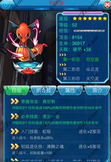 6.烈空座,潜力股!+2拥有强大的吸血,而且一转还有三级进击!神豪必备。与帝牙的搭配使他被许多神豪所青睐。