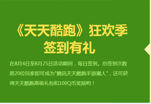 在8月4日至8月24日活动期间,每日签到。总签到次数前20位玩家即可成为"腾讯天天酷跑手游潮人",还可获得天天酷跑高级礼包和100Q币奖励哟!