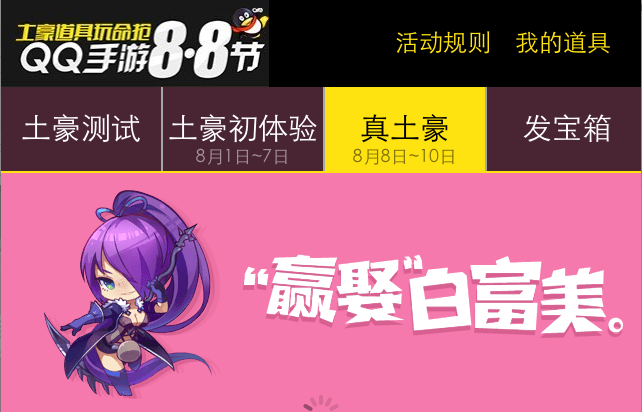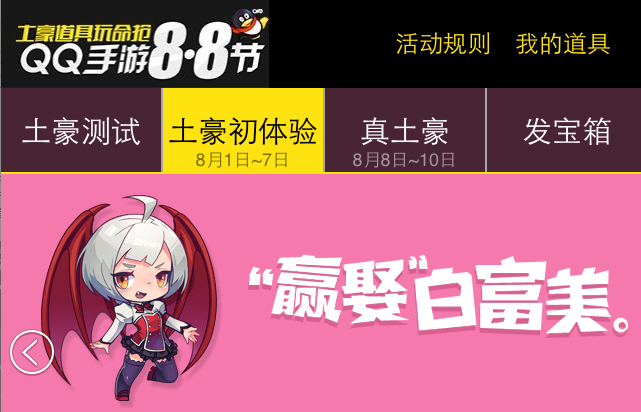 活动内容:活动期间只要进入天天酷跑QQ手游8.8节活动页面,点击土豪初体验就可以领取获得天天酷跑游戏礼包。