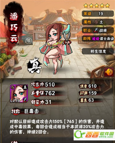 技能:毒妇击。对默认目标造成攻击力155%的伤害,并造成中毒效果,每回合造成相当于本武将20%攻击力的伤害,持续2回合。