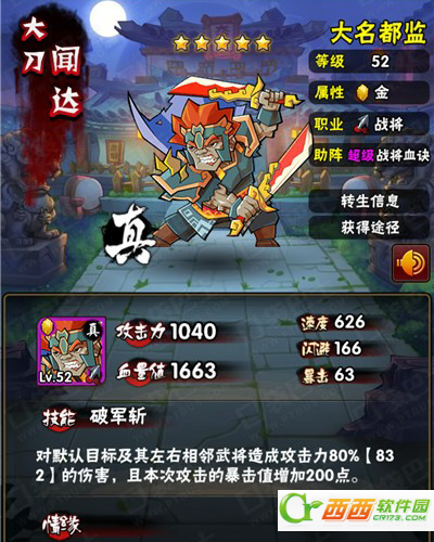 技能:破军斩,对默认目标及其左右相邻武将造成攻击力80%的伤害,且本次攻击的暴击值增加200点。