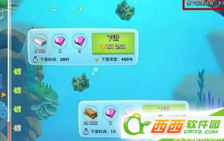 另外潜水艇是有次数限制的,如图中所示限制次数为3次,玩家在探寻后三次宝藏后潜艇就无法下潜了,这时候就需要升级潜艇来增加次数并且探寻更深的宝藏。