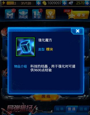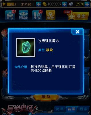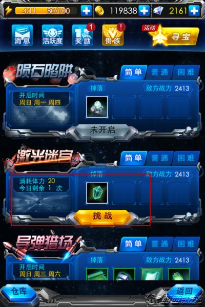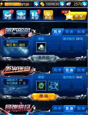 3、导弹猎场,获得升级材料(周日,周三,周六开放)每天可挑战两次,难度分为简单,普通,困难,困难目前未开放,简单要20体力,普通40体力。