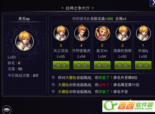 战神之争也就是竞技场,是玩家pk的地方,等级25级以上方可参加,奖励有龙晶和龙魂,排名越高,奖励越丰富。