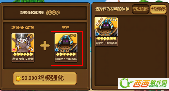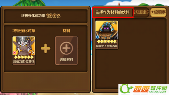 作为终极强化材料的小伙伴也必须是6★伙伴,材料伙伴的等级对终极强化的成功率没有影响,终极强化的成功率都是100%,系统会自动筛选出满足条件的小伙伴,出现下面界面后,点击材料界面的小伙伴。
