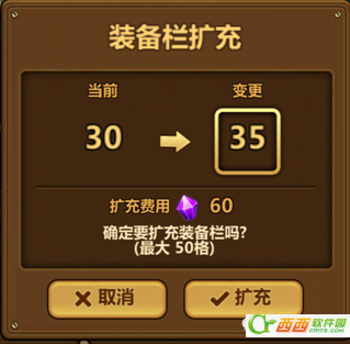 装备栏也是使用同样的方法扩充,点击跳转到装备栏后,点击下方的添加按钮,就会弹出装备栏扩充界面,装备栏最大扩充到50格。