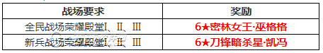 8月16日晚24:00结算时,全民战场和新兵战场达到下表要求的玩家,即可在8月18日晚18:00起通过邮箱获得对应的奖励,享受快人一步优先获得暂未开放6★伙伴的特权。