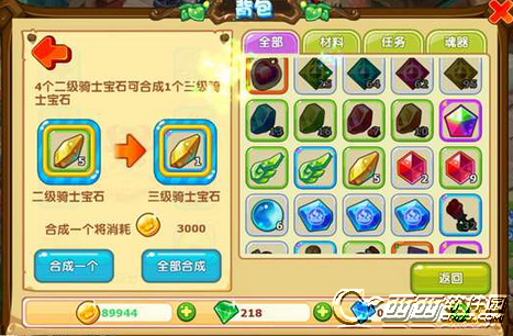 游戏中的宝石有增强物理防御的欧泊宝石、增强法术防御的海蓝宝石、增强法术攻击的圣魔宝石、增加生命上限的石榴宝石、提高速度的骑士宝石、增强物理攻击的冒险宝石和增加闪避的碧绿宝石,共7种。每种宝石可以通过合成强化,每4个相同种类、相同等级的宝石可以合成为一个同种类高一级宝石,比如使用4个二级骑士宝石可以合称为1个三级骑士宝石。
