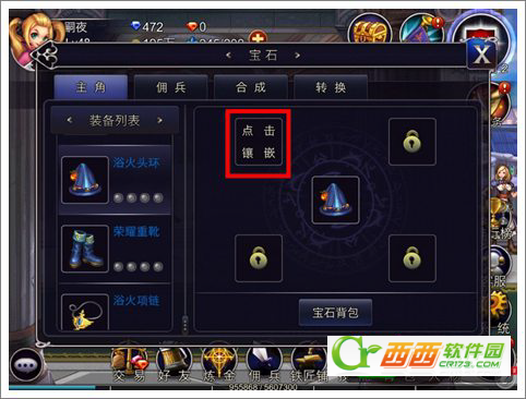 点击之后我们可以看到宝石系统的主界面,我们可以选择一件想要镶嵌的装备,点击红框处。