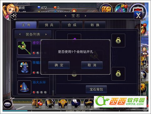 每件装备都能镶嵌多个宝石,但是宝石槽初始只有一个,这时候我们就需要给装备开孔,点击锁定的宝石槽,然后会提示需要金刚钻,点击确定就能给武器开一个新的宝石槽了。
