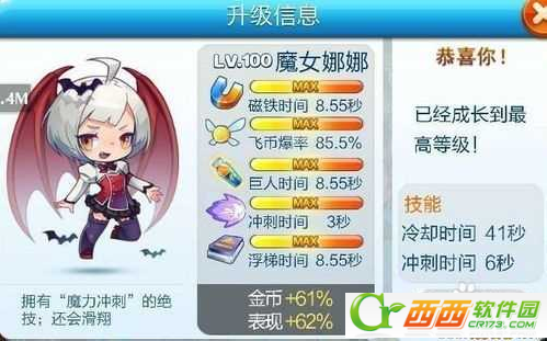 满级效果:磁铁时间8.55秒,飞币爆率85.5%,巨人时间8.55秒,冲刺时间3秒,浮梯时间8.55秒。
