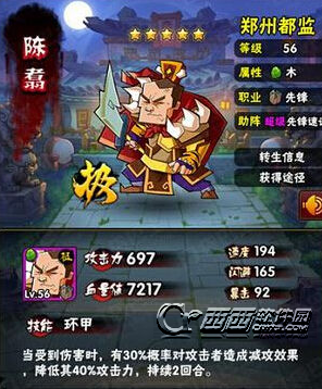 解析:陈翥作为一个先锋,属于肉盾型的存在。属性也比较一般,但是技能很不错。可以对攻击者造成减攻,两回合最高降低80%的攻击力,在这样的情况下,给了整个阵容喘息的机会,尤其是对方攻击力很强的情况下。但是陈翥的问题也在于不好配缘,同时没办法组成一个主流的阵容。小编不是推荐,除非玩家们想组成左八都监的阵容。