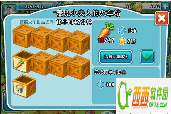 点击装箱的时候这里显示需要的货物不足时,下面会有请求帮助,点击一下就可以了,注意下:这里一共有3次请求帮助的机会。点击之后我们可以看到萝卜箱那里会有个感叹号,这个与果树枯萎请求帮助是一样的哦!