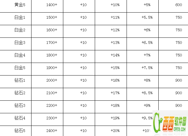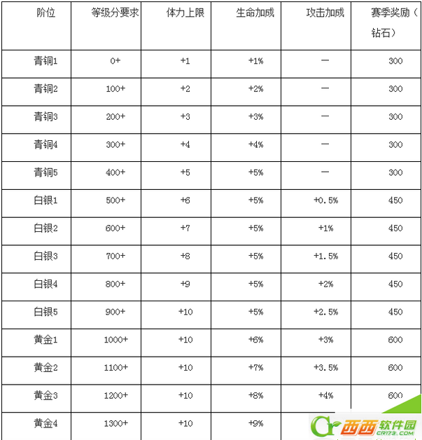 竞技场分为青铜、白银、黄金、白金、钻石、王者五个组别,除了赛季奖励(钻石)之外,不同的阶位还可以获得不同程度的属性加成以及额外增加体力上限的奖励,详情见下表。