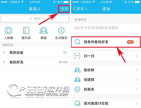 1)进入手机QQ后,在【联系人】界面点击右上角的【添加】功能,在【添加】界面就能看到【按条件查找好友】功能了,点击进入。(如下图所示)