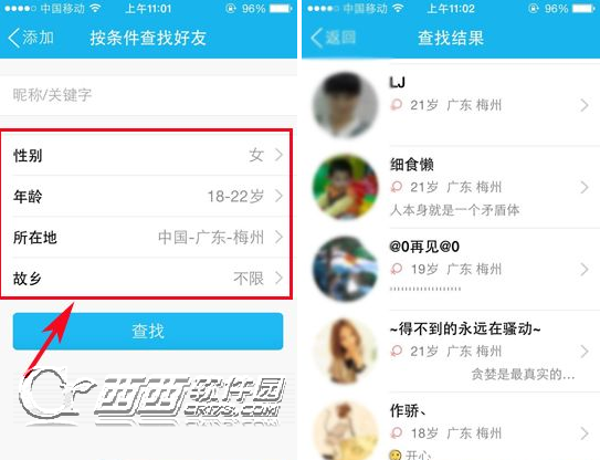 2)在【按条件查找好友】界面设定好条件,然后点击【查找】即可看到相关QQ信息了。(如下图所示)
