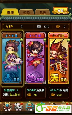 天厢房:消耗300元宝,有机会获得4~5星伙伴,每48小时免费一次!当然也准备了10连抽哦!2400元宝一次!