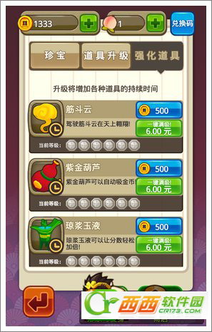 除了在游戏中要注意收集道具外,我们还可以通过升级强化来增强道具效果,例如强化筋斗云来延长它的持续时间。