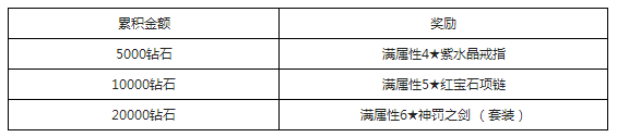 活动时间段内,累积充值金额达到以下额度,即可立刻通过邮箱获得对应奖励,顶级首饰、6★套装武器尽在其中!各项充值活动,以及游戏内充值任务,互不冲突,可同时参加哟!