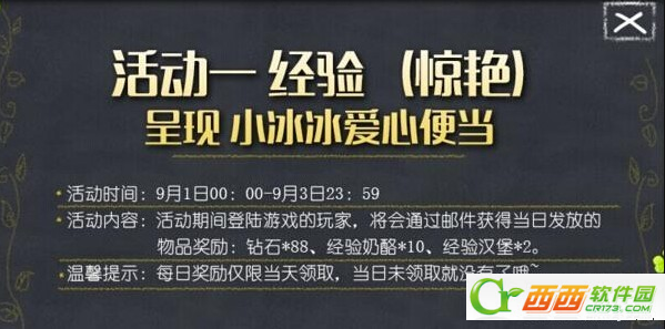 活动期间登陆游戏的玩家,将会通过邮件获得当日发放的每日便当奖励:钻石*88、经验奶酪*10、经验汉堡*2。