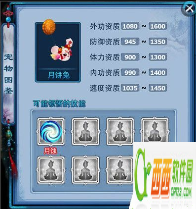 | 宠物说明 | 中秋活动期间限时出售珍稀宠物月饼兔,自带奇特外功技能“月蚀”。 | ||