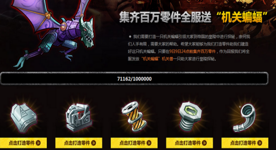 玩家在9月9日24点,也就是10日0点之前完成集齐百万零件就可以获得机关兽机关蝙蝠啦,注意这里的一百万的零件不是让一个玩家打造,而是所有参与玩家一共打造。