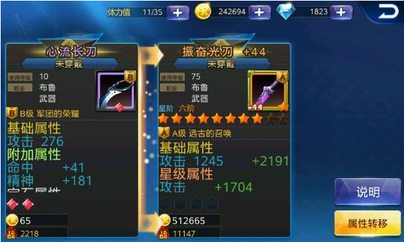 新版中,某件装备的强化、升星、锻造、等级等属性,可以转移到另外一件装备上。