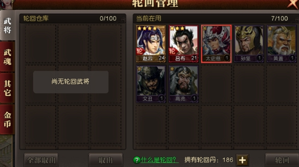 有自动轮回、手动轮回、不可轮回三种属性。金币、武魂等都是自动轮回,不需要设置;武将是手动设置轮回,需要消耗轮回丹,轮回丹可通过长期目标、声望兑换、商城购买等渠道获得;部分物品不可轮回。