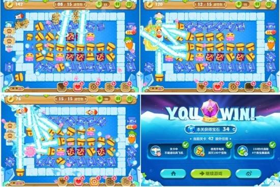 (3)150秒内清除4个救生圈道具。本关虽然金钱超多,但有一定的难度。游戏开始后,先在萝卜处安装两个冰锤塔,选择清除萝卜左侧的绿色雪糕后安装手电筒,选择清除其左侧的道具后,以安装手电筒为主。